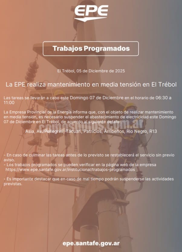 La Empresa Provincial de la Energía (EPE) ha comunicado a los vecinos de El Trébol la necesidad de suspender el servicio eléctrico en varias zonas de la ciudad para llevar a cabo trabajos programados de mantenimiento en la red de media tensión.