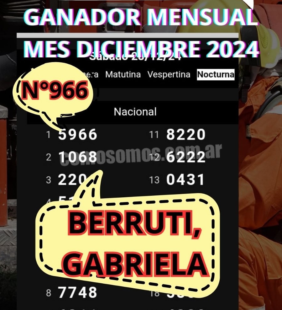 A través del sorteo realizado el sábado pasado por lotería nocturna nacional , se definió al segundo afortunado del bono contribución 2024/2025 de los Bomberos Voluntarios de El Trébol. Con el número 966, Gabriela Berrutti se llevó un premio en efectivo de $40.000.-