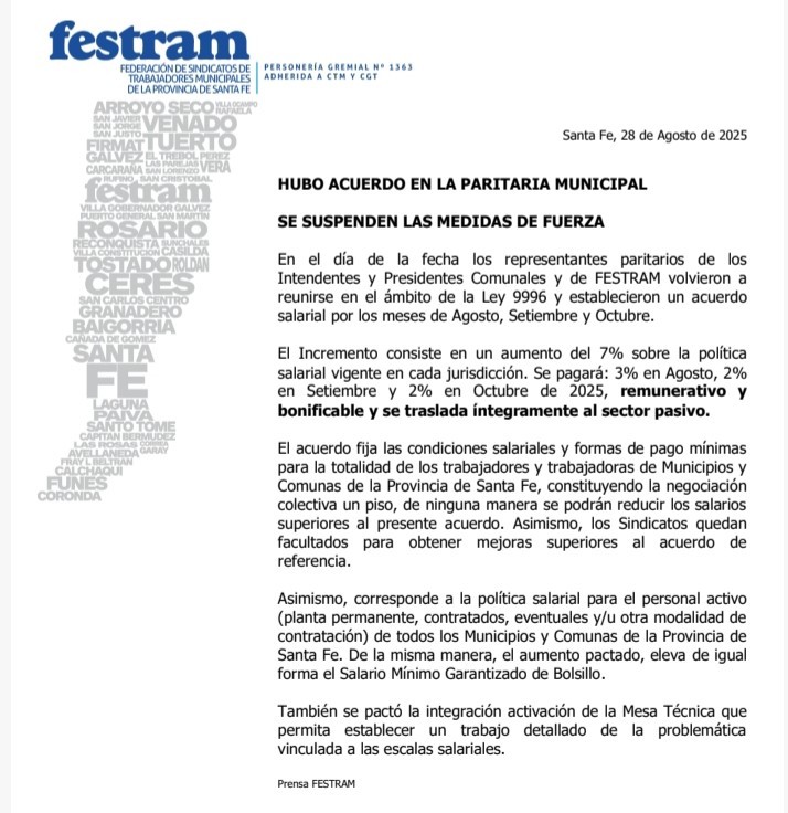 El acuerdo fija las condiciones salariales y formas de pago mínimas para todos los trabajadores de municipios y comunas de la provincia de Santa Fe. Si bien constituye un piso de negociación, los sindicatos quedan facultados para obtener mejoras superiores en sus respectivas jurisdicciones. Este aumento también eleva el salario mínimo garantizado de bolsillo.
