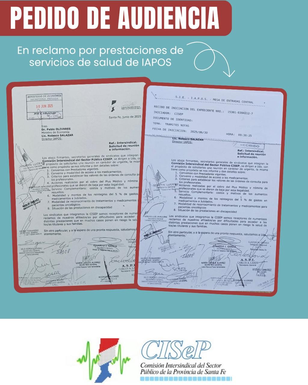 La Asociación del Magisterio de Santa Fe (AMSAFE), en conjunto con los gremios que conforman la Comisión Intersindical del Sector Público (CISEP), presentó hoy un enérgico reclamo formal ante las autoridades provinciales. El pedido, dirigido al Ministro de Economía, Dr. Pablo Olivares, y al Director de IAPOS, Lic. Nolasco Salazar, busca una reunión urgente para abordar la grave situación que atraviesan los afiliados a la obra social provincial.