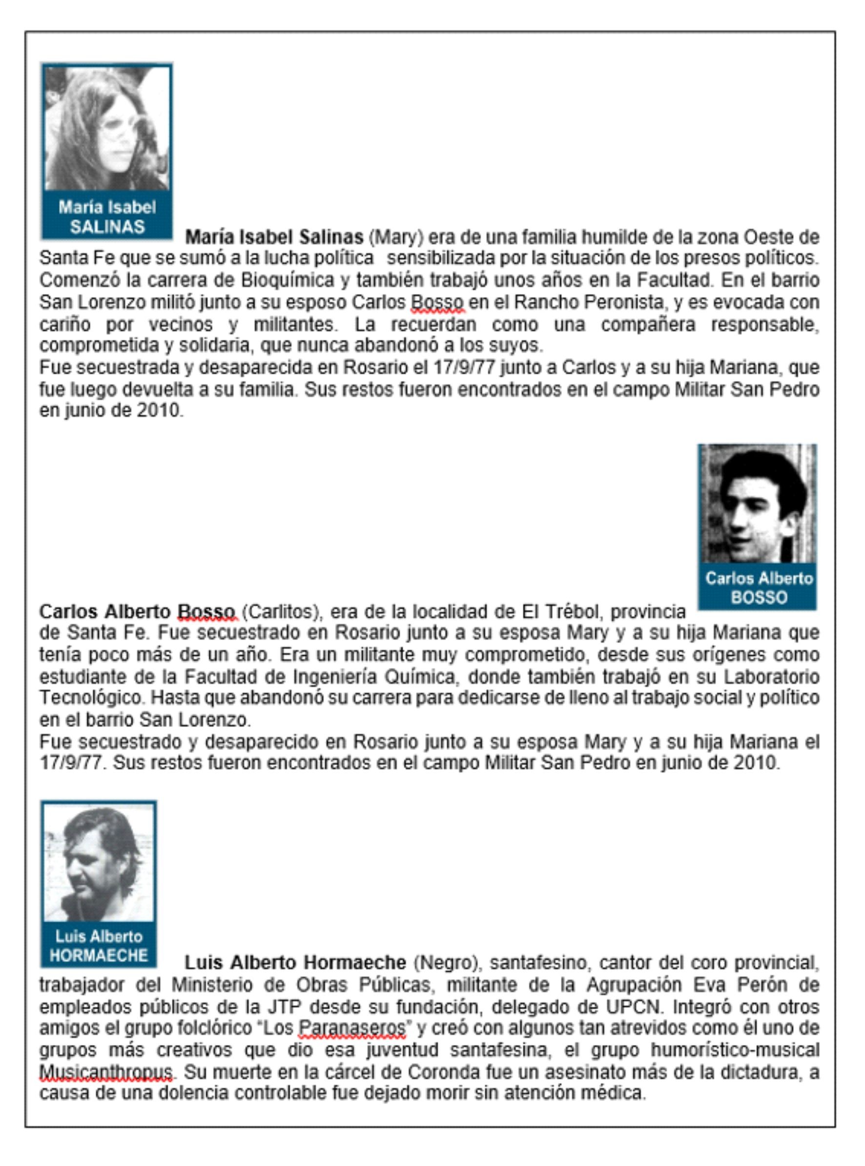 Familiares, amigos y compañeros de Carlos Alberto Bosso, María Isabel Salinas y Luis Alberto Hormaeche recordaron el lunes 4 de septiembre a estas tres víctimas de la última dictadura cívico-militar descubriendo tres baldosas con sus nombres y trayectorias frente al anexo donde funcionan los laboratorios de la Facultad de Ingeniería Química de la Universidad Nacional del Litoral.