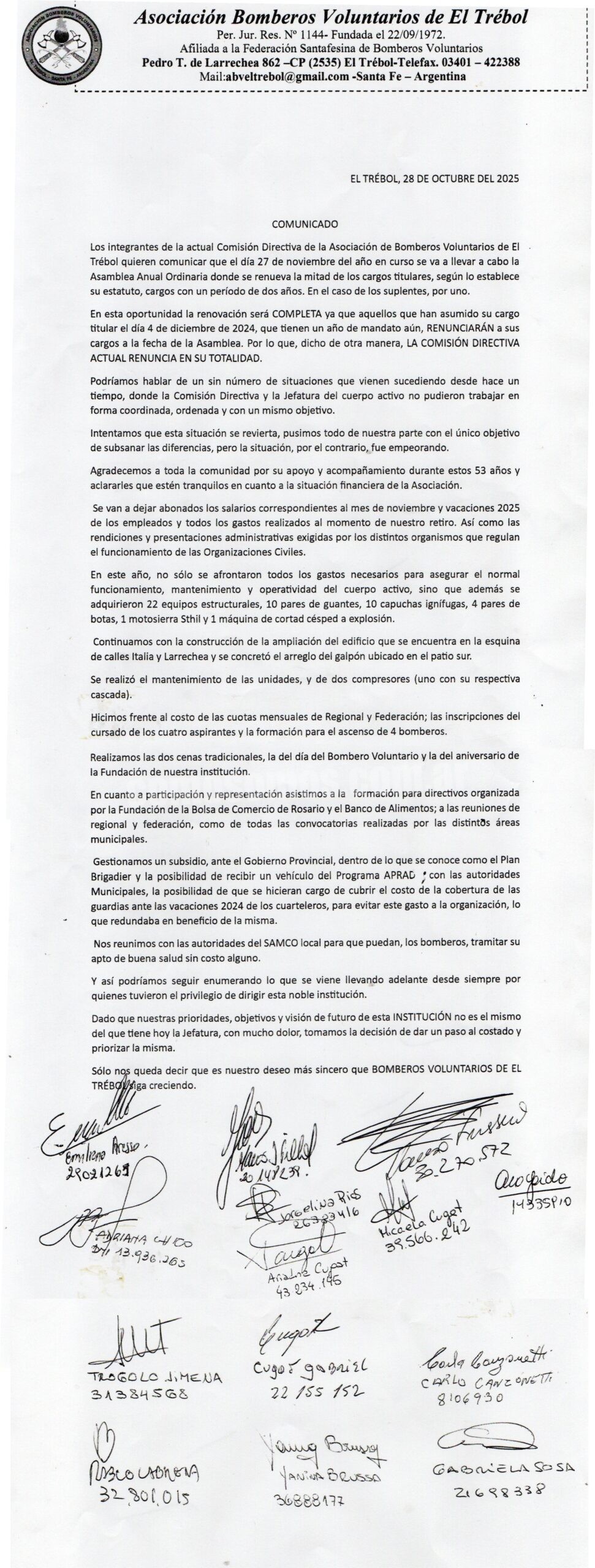 La actual Comisión Directiva de la Asociación de Bomberos Voluntarios de El Trébol ha emitido un comunicado oficial informando sobre la convocatoria a la Asamblea Anual Ordinaria y la renuncia total de sus miembros.