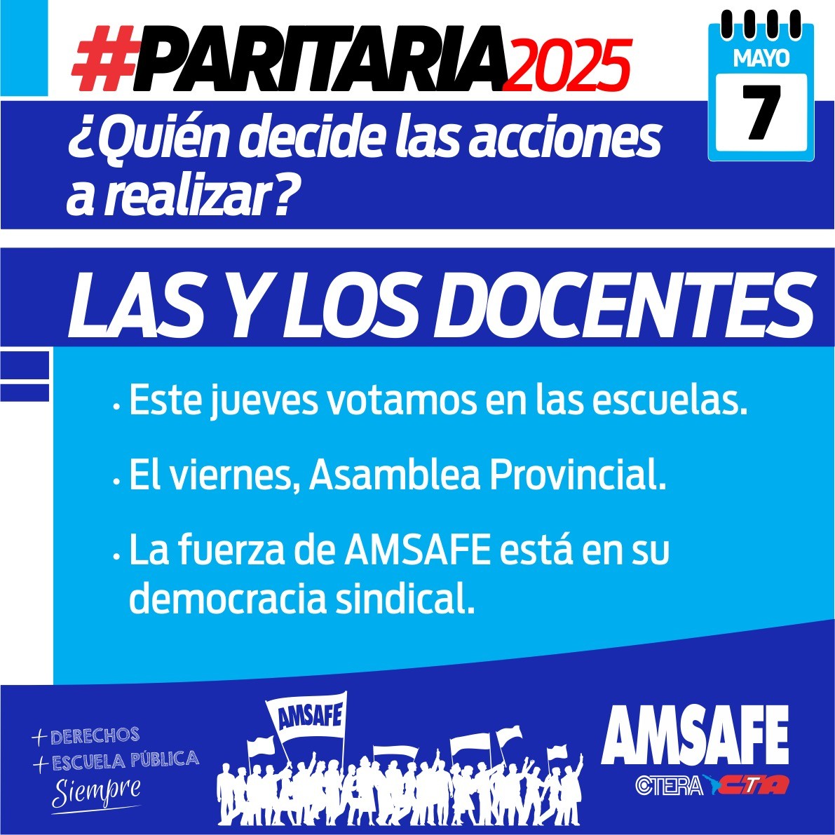 Finalmente, AMSAFE reafirmó su compromiso con la democracia sindical y anunció la realización de asambleas departamentales en toda la provincia y una Asamblea Provincial crucial este viernes a las 11 hs. En este encuentro, con la participación de miles de docentes, se definirán las medidas a seguir ante la insatisfactoria propuesta del gobierno.