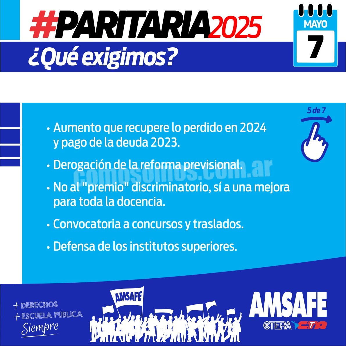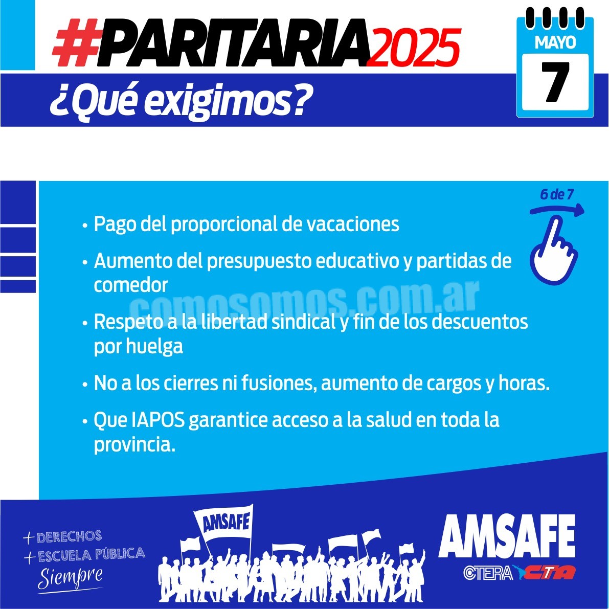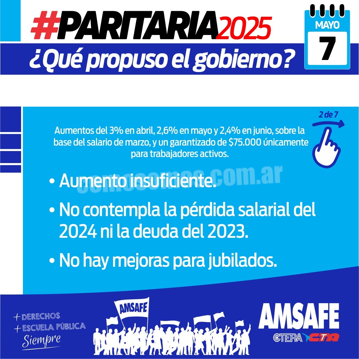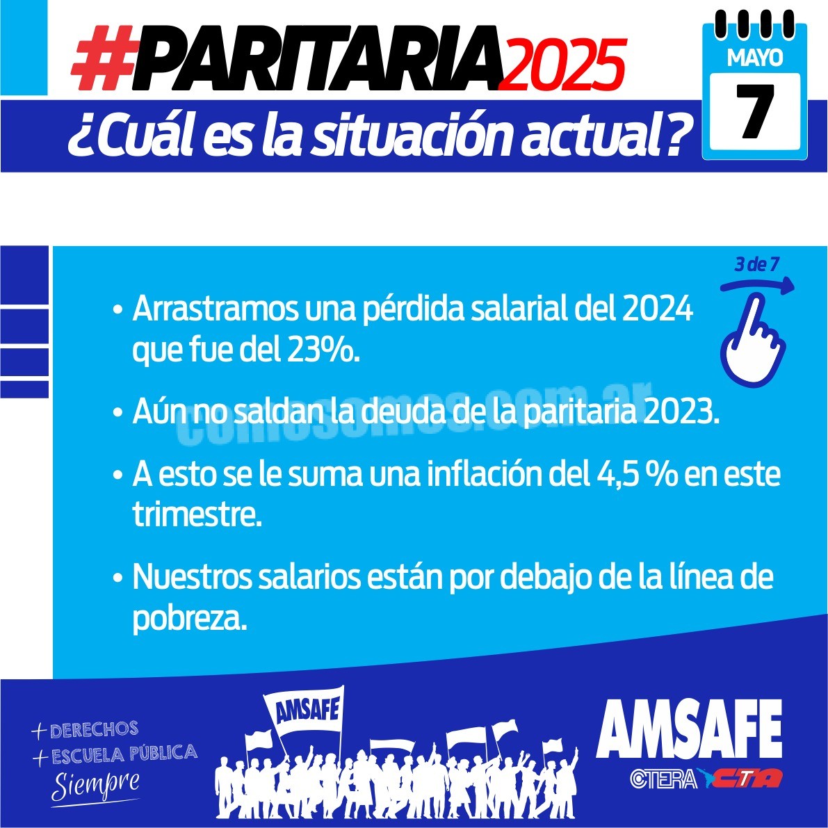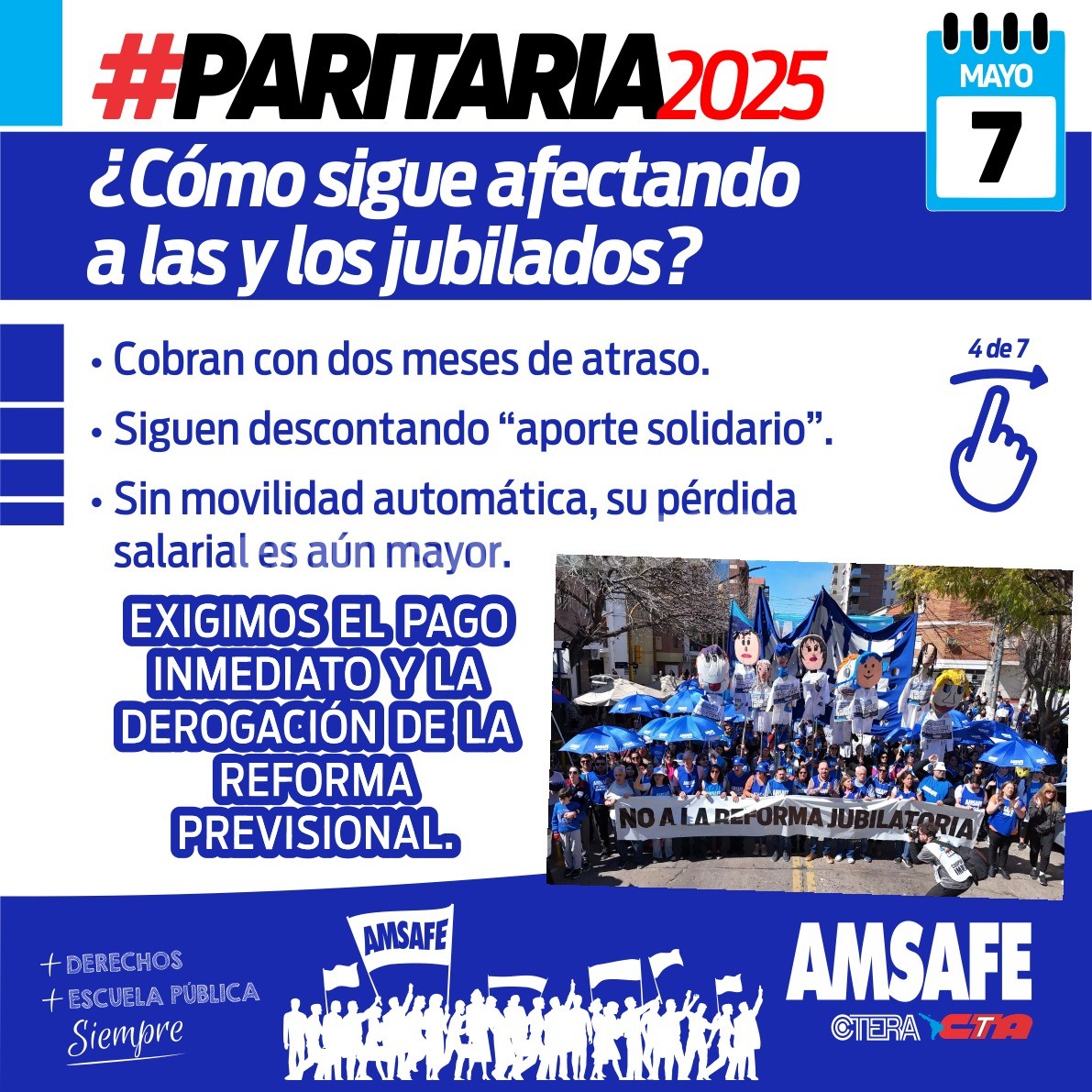 La conducción de AMSAFE también manifestó su profunda preocupación por el impacto negativo de la propuesta en los docentes jubilados. «Los jubilados no perciben la compensación. En el primer trimestre hubo un 9,4% de inflación, pero sólo un 5% de incremento para ellos. Además, los aumentos llegarán con una demora de 60 días y apenas se aplicará un 3% del 8% destinado a los activos. Esta propuesta sigue castigando a las compañeras y compañeros jubilados», lamentaron.