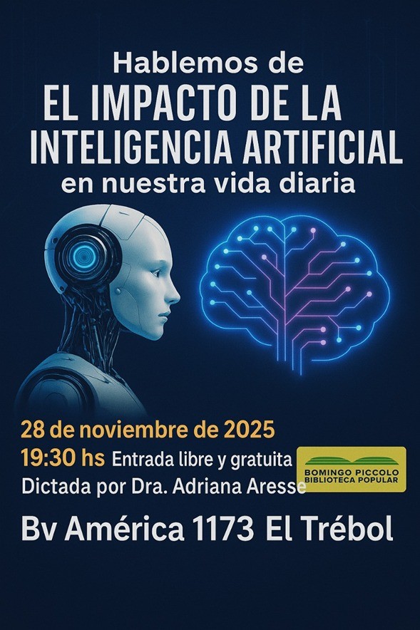 El próximo viernes 28 de noviembre se llevará a cabo un conversatorio participativo esencial para comprender la revolución tecnológica actual: «El impacto de la Inteligencia Artificial en nuestra vida diaria». La actividad, de acceso libre y gratuito, se realizará a las 19:30 horas en las instalaciones de la Biblioteca Piccolo, ubicada en Bv. América 1173.