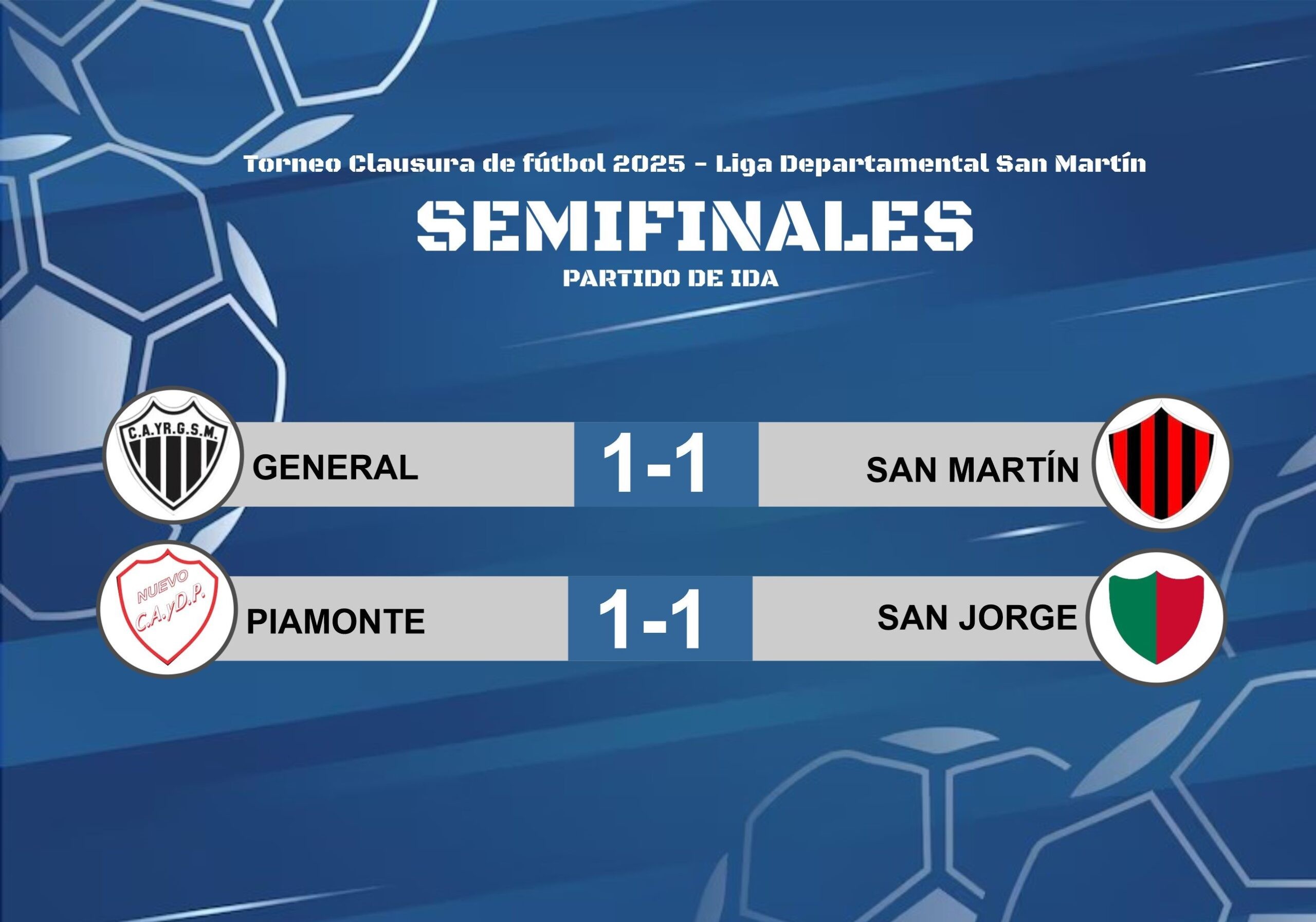 Resultados Idénticos: Las dos series de semifinales del Torneo Clausura de la Liga Departamental San Martín quedaron completamente abiertas. Piamonte y Atlético San Jorge, al igual que General y San Martín, empataron 1 a 1 en sus respectivos partidos de ida. Todo se definirá en las revanchas el próximo miércoles.