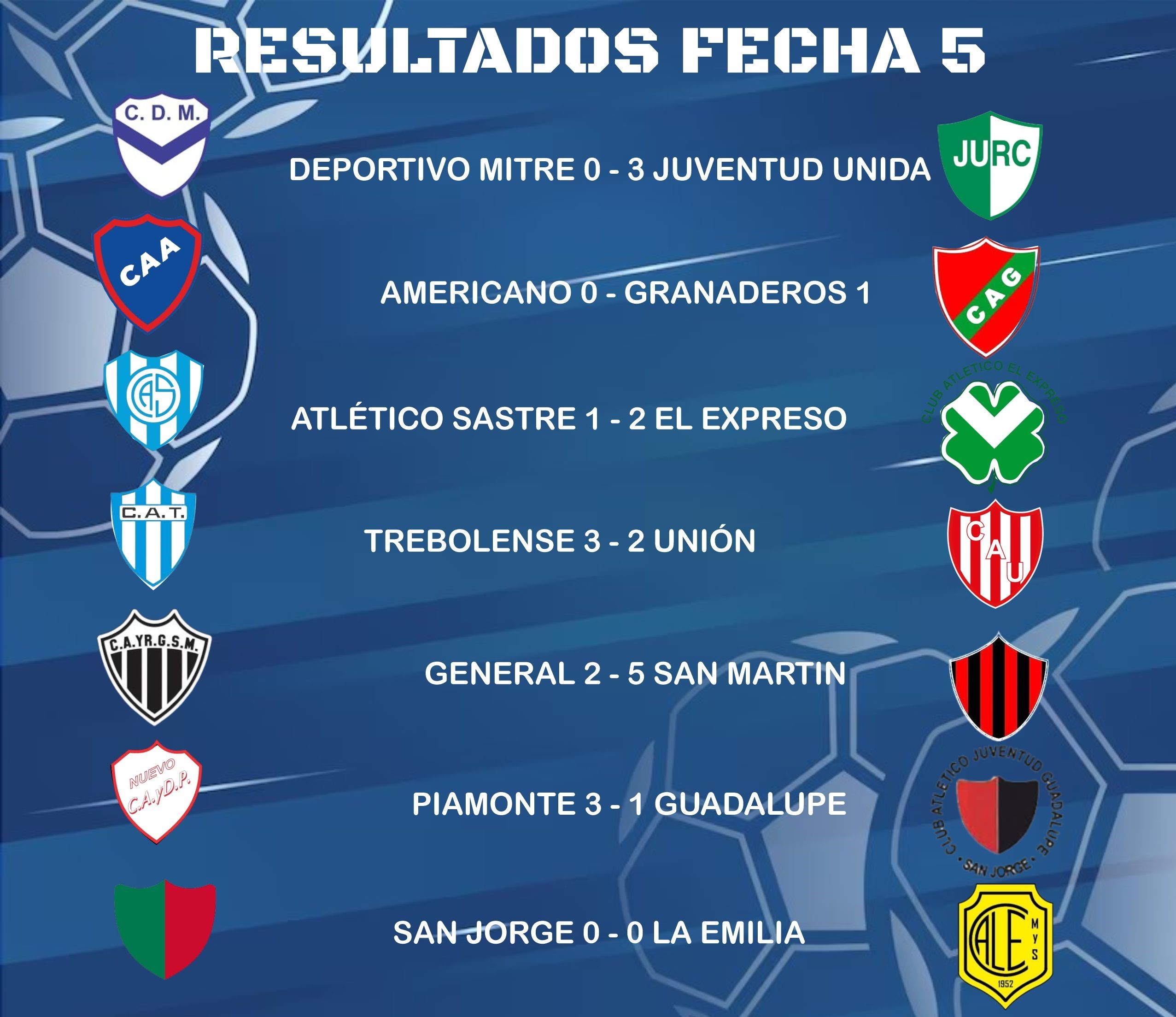 Primeras victorias para Juventud Unida y Piamonte: La fecha 5 significó la primera alegría de la temporada para Juventud Unida, que goleó 3 a 0 a Deportivo Mitre, y para Piamonte, que venció 3 a 1 a Juventud Guadalupe.