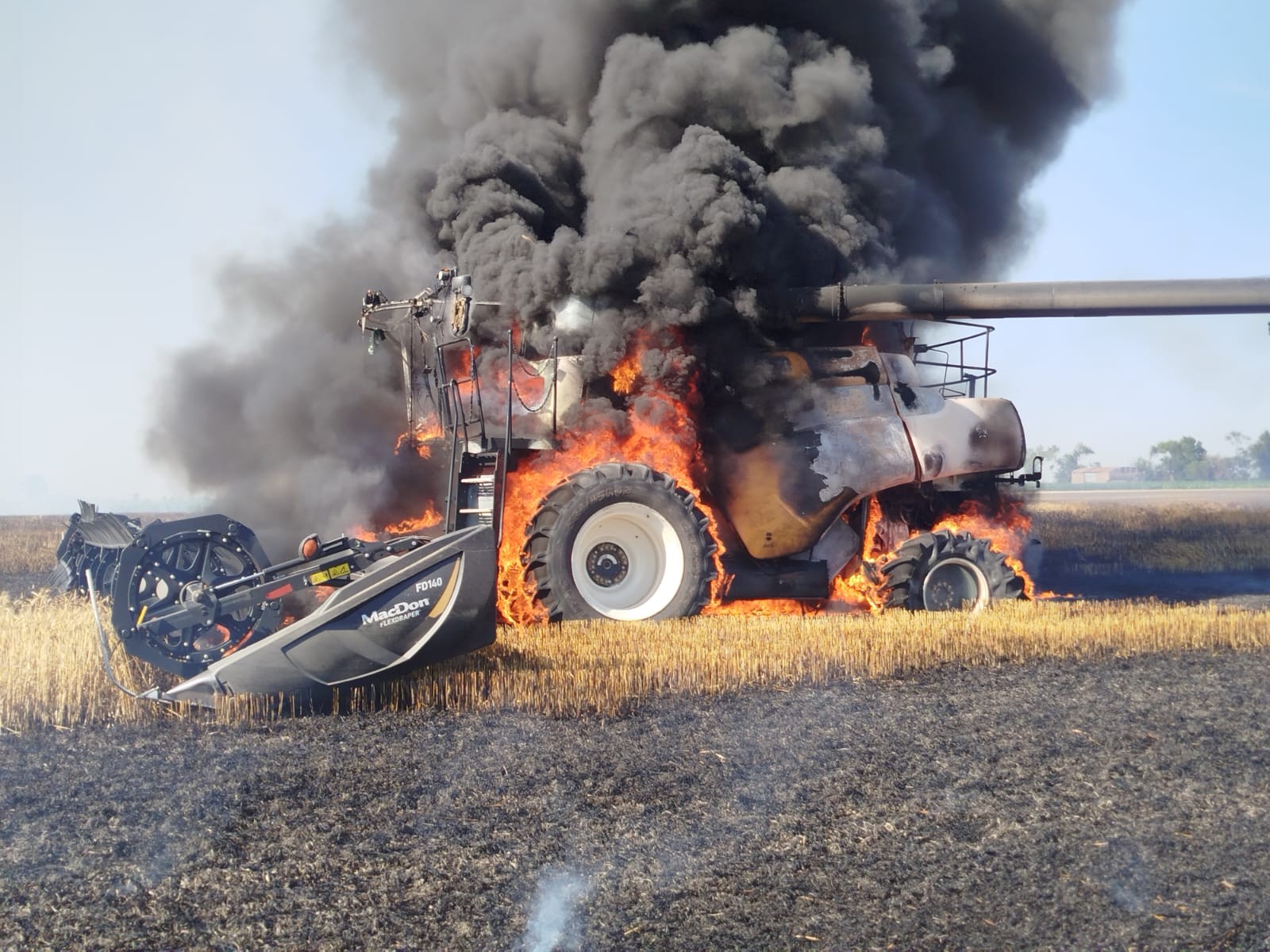 Una jornada de trilla se vio interrumpida este miércoles por la tarde, cuando una cosechadora se incendió completamente mientras trabajaba en un lote de trigo.