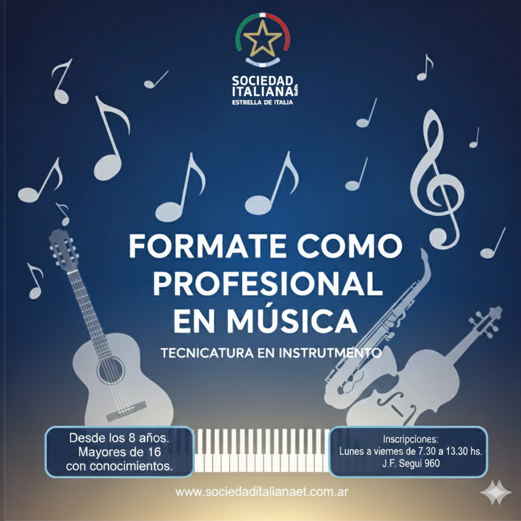 La Sociedad Italiana «Estrella de Italia» de El Trébol abre sus puertas a todos los amantes de la música, anunciando la apertura de inscripciones para su tecnicatura en Música con especialidad en instrumento.