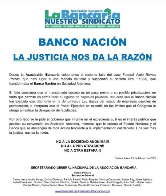 La secretaria general enfatizó que la Asociación Bancaria está satisfecha con el fallo, ya que protege el carácter público del banco y su rol fundamental en la economía del país. Asimismo, advirtió que la transformación en Sociedad Anónima sería un paso previo a la privatización del Banco Nación.