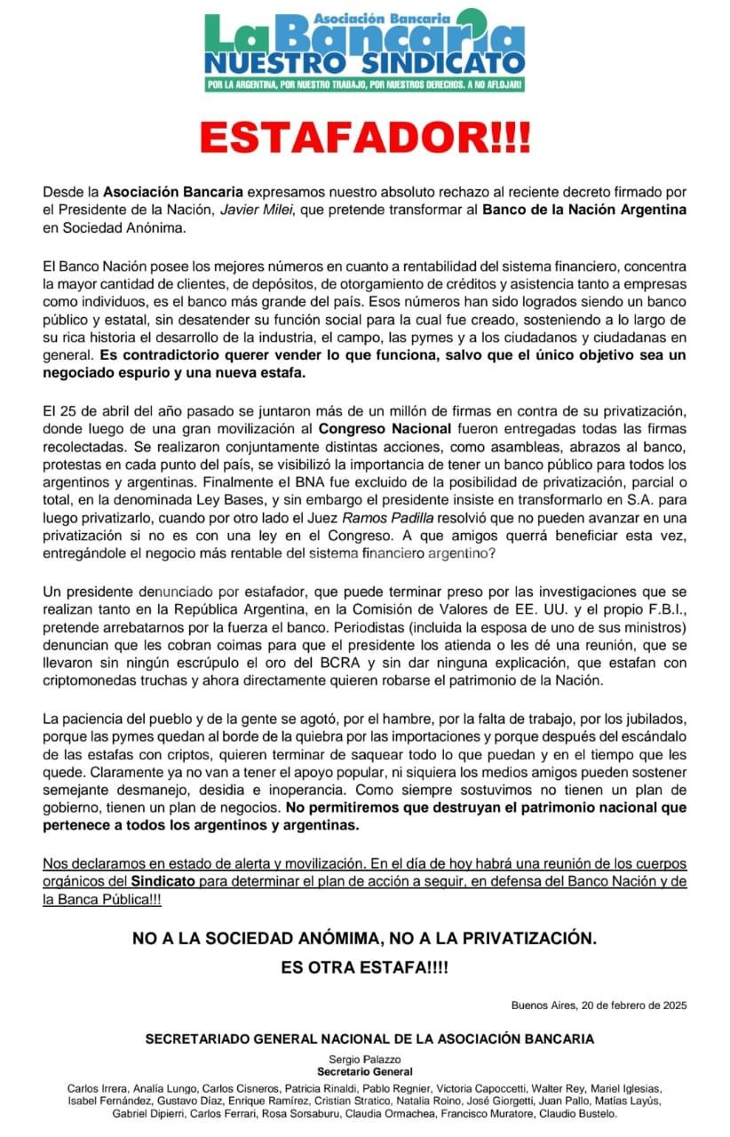 - El comunicado de La Bancaria incluye duras críticas al presidente, mencionando investigaciones en curso en Argentina y Estados Unidos, incluyendo la Comisión de valores de estados unidos y el FBI.