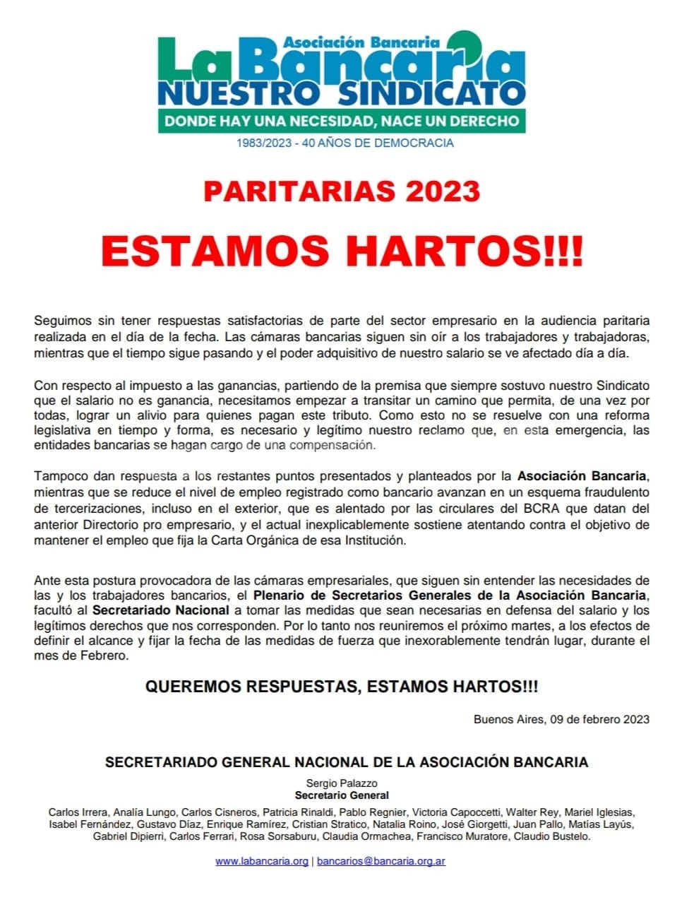 La Asociación Bancaria continúa sin poder cerrar su paritaria y, por ese motivo, desde el gremio emitieron un duro comunicado de prensa asegurando que están hartos.