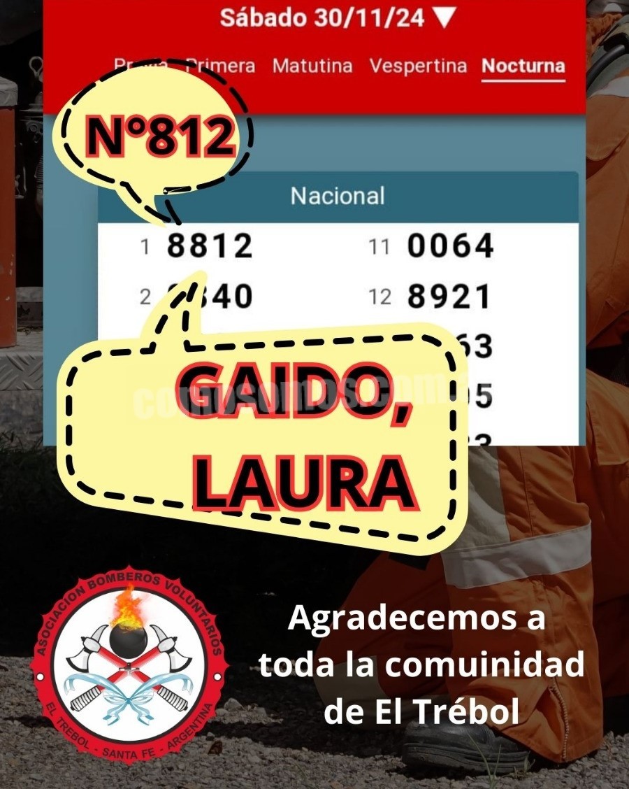 A través del sorteo realizado el sábado pasado por lotería nocturna nacional , se definió al primer afortunado del bono contribución 2024/2025 de los Bomberos Voluntarios de El Trébol. Con el número 812, Laura Gaido se llevó un premio en efectivo de $40.000.