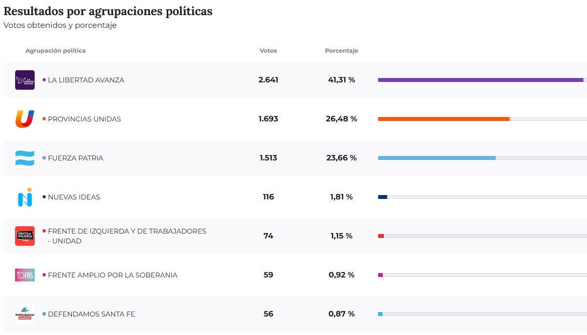 El candidato a diputado por Santa Fe de la fuerza del presidente Javier Milei, Agustín Pellegrini, fue el más elegido en el escrutinio provisorio, cosechando un total de 2641 votos. Este número lo posicionó como el gran ganador de la jornada en la localidad.