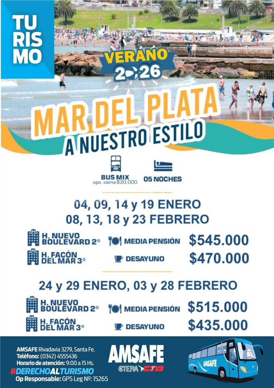 AMSAFE piensa en el merecido descanso de sus docentes. La Secretaría de Asuntos Sociales ha oficializado el lanzamiento de su Propuesta Turística Verano 2026, una iniciativa que busca brindar opciones de recreación y relax a todas las afiliadas y afiliados tras un año de arduo trabajo.